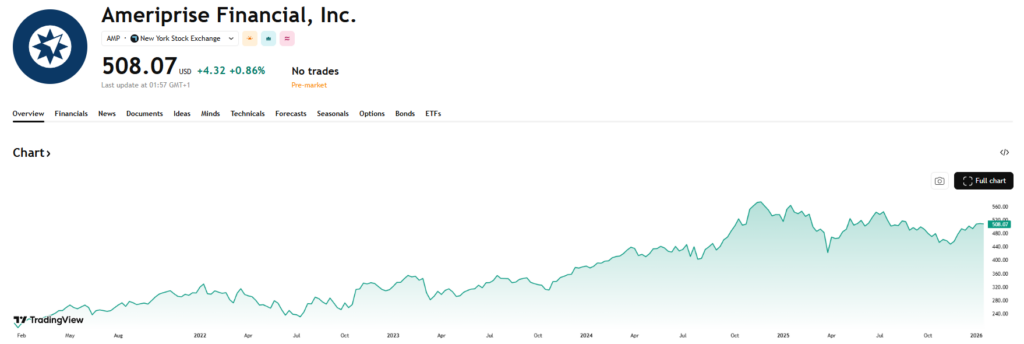 Ameriprise Financial is een Amerikaanse financiële dienstverlener die actief is in vermogensbeheer, financiële planning en verzekeringen. Het bedrijf beschikt over stabiele inkomsten en een kapitaallicht model, waardoor er veel ruimte is voor kapitaaluitkeringen. Een belangrijk deel van de winst vloeit terug naar aandeelhouders via structurele aandeleninkoop, wat de winst per aandeel jaar na jaar ondersteunt. De voorbije 10 jaar verminderde het aantal uitstaande aandelen met meer dan 6% per jaar.