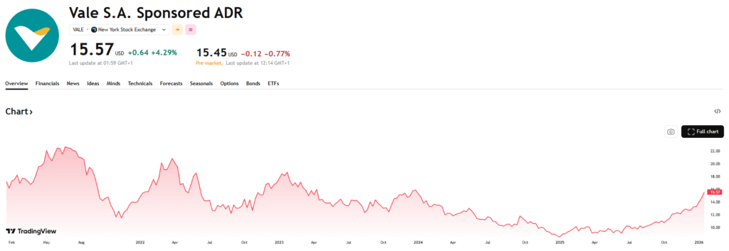 Het Braziliaanse bedrijf Vale is een van de grootste mijnbouwbedrijven ter wereld en een belangrijke producent van ijzererts en nikkel. Het aandeel staat genoteerd op de New York Stock Exchange via een ADR. Vale biedt blootstelling aan de wereldwijde vraag naar grondstoffen, met extra aandacht voor prijsschommelingen en politieke risico’s in Brazilië.