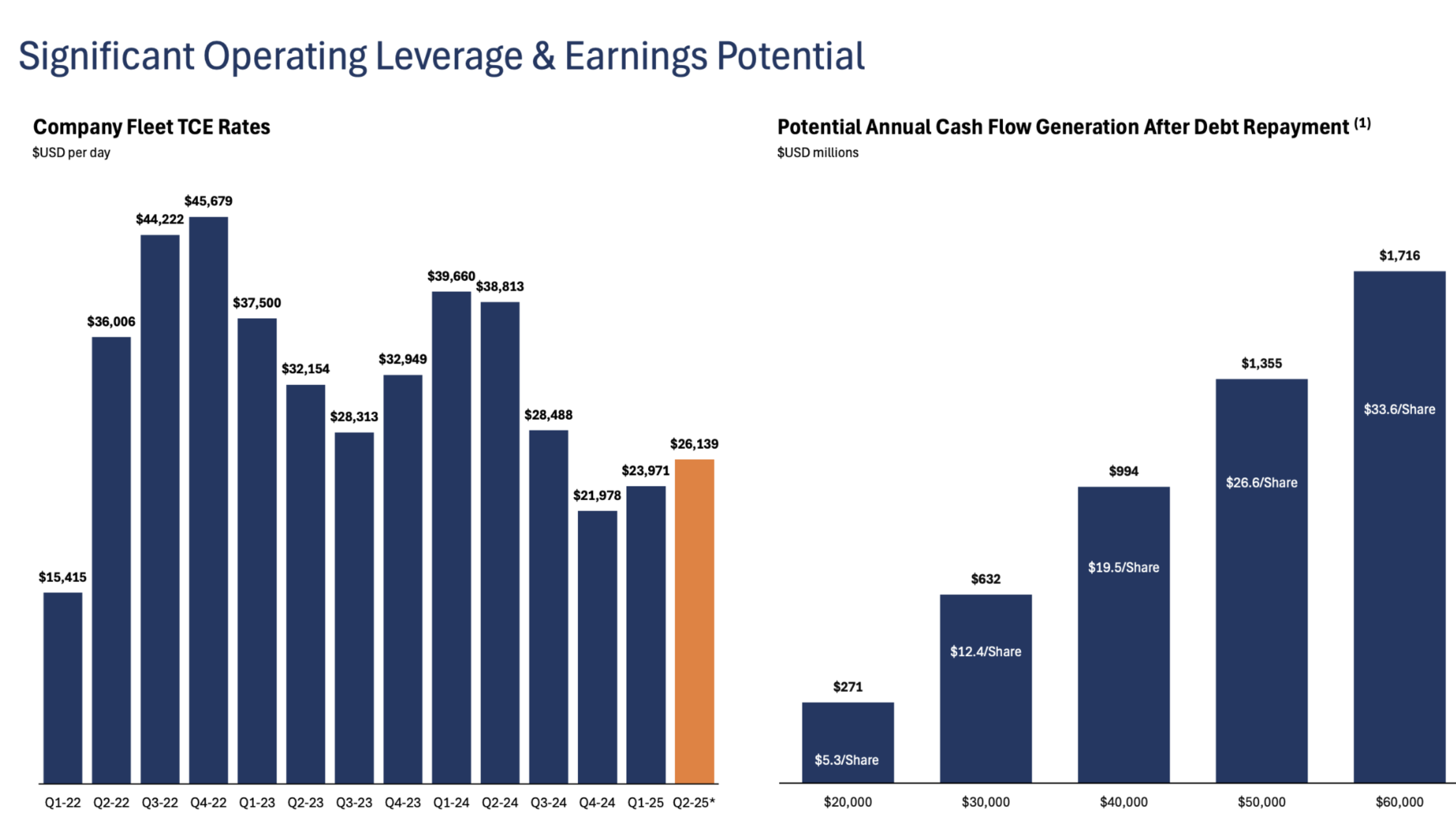 De tarieven voor olietransport herstellen geleidelijk na een dip in het vierde kwartaal. Tijdens de recente analistencall bleek dia 9 bijzonder verhelderend. Deze dia vat het potentieel van Scorpio Tankers samen, met links de gemiddelde kwartaaltarieven en rechts de verwachte vrije kasstroom per aandeel.