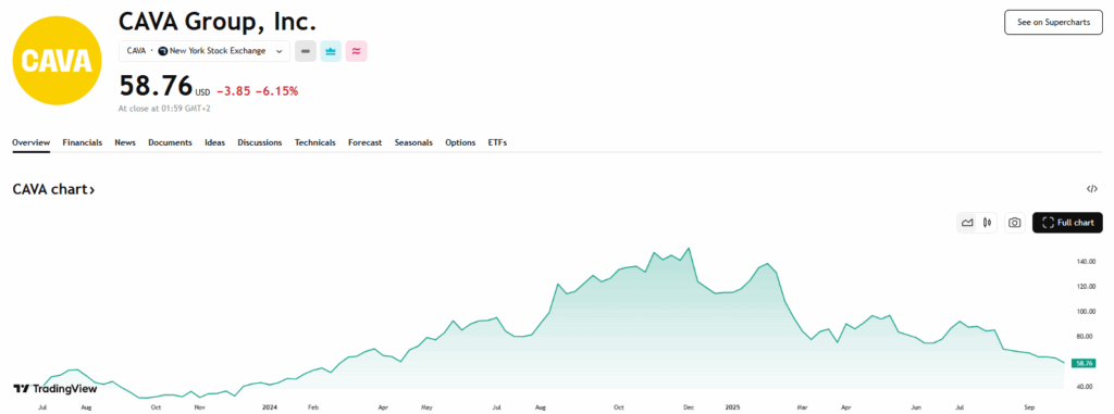 De opkomende restaurantketen uit de VS is met zijn 382 restaurants een groeiende speler. Hun focus ligt op het aanbieden van verse producten uit de mediterrane keuken, om zo een gezonder alternatief te bieden binnen het fast-casual segment. Bowls, pitaās, spreads en dips doen ons denken aan Chipotle, en als we dit combineren met een vleugje mediterrane groenten, tzatziki, hummus en kip, krijgen we CAVA. Met een koersverlies van 43% tot dusver in 2025 kondigde het management aan te zorgen voor optimalisaties binnen de organisatie. Op die manier willen ze hun marges verbeteren en een betere service kunnen bieden aan de klanten.