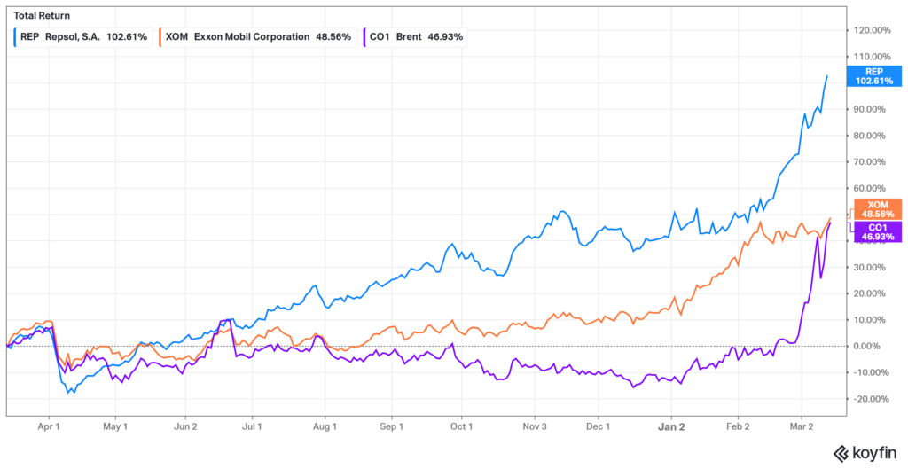 Repsol, ExxonMobil en Brent olieprijs evolutie voorbije 12 maanden