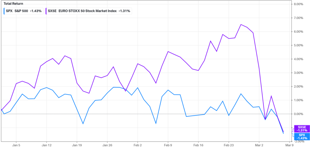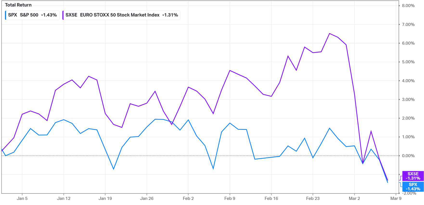 De eerste week van het wapengekletter in het Midden-Oosten woog veel zwaarder op de Europese beurzen dan op de Amerikaanse. Europa was dan eindelijk de maat aan het nemen van Wall Street, maar dat lijkt nu even gebroken. De S&P 500 verloor deze week (rond het sluiten van de Europese beurzen) minder dan 2% en de Nasdaq zelfs amper 0,4%. De Eurostoxx 50 verloor liefst 7% en de Bel20 kwakte 4,7% lager. Daarmee is alles weer te herdoen. De S&P 500 noteert 1,2% lager dan begin dit jaar: dat is bijna hetzelfde als de Euro Stoxx 50 die 1,5% in het rood staat. De Bel20 heeft nog 2,1% winst over, maar dat is een magere troost. De terugval was extra pijnlijk, omdat er een welgekomen wissel van sectoren en soort bedrijven bezig was. In plaats van bigtech, software- en bedrijven met lage kosten en hoge winstmarges, herontdekten beleggers de kwaliteiten van bedrijven uit de maakindustrie, met vele medewerkers, fabrieken en vestigingen. Hun activiteiten worden tenminste niet bedreigd door de eerste de beste startup gewapend met artificiële intelligentie. En hebben we niet evengoed die vensterglazen, auto’s en machines nodig?