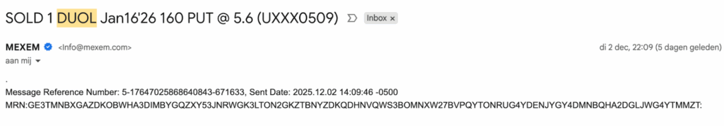 Ik verwacht een verder dalende koers voor Duolingo in december door het fenomeen van tax-loss selling, wat vermoedelijk extra verkoopdruk zal geven. Op vlak van timing zou je dan beter later kunnen kopen, maar anderzijds zal de premie ook dalen met iedere dag dat je wacht. Je kan ook wachten tot midden december of 20 december, maar dan zal de premie voor de januarioefening ook lager zijn. Ook wil ik net voor de januari-uitoefening dit order inleggen omdat er tegen dan geen kwartaalcijfers uitkomen.
