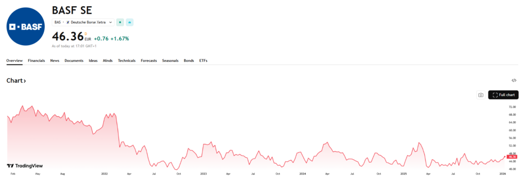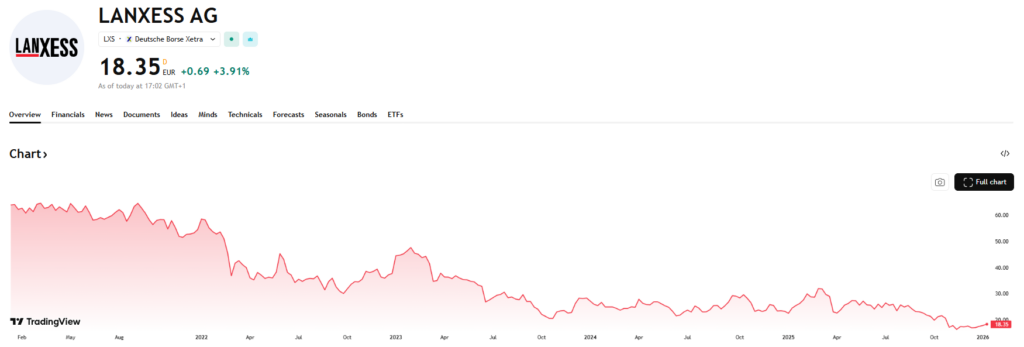 Lanxess is een Duitse producent van gespecialiseerde chemische producten, met een sterke focus op toepassingen voor de auto- en rubberindustrie. In vergelijking met BASF is Lanxess kleiner, minder gediversifieerd en daardoor ook kwetsbaarder voor cyclische tegenwind. De afgelopen jaren kampte het bedrijf met dalende volumes en druk op de winstgevendheid, wat resulteerde in een lage beurswaardering. De omzet in 2025 was de laagste in 10 jaar tijd en het resultaat ging in het rood. De aandelenprijs verloor op 5 jaar tijd 72% van zijn waarde. Lanxess is een uitgesproken herstelkandidaat als de industriële cyclus keert.