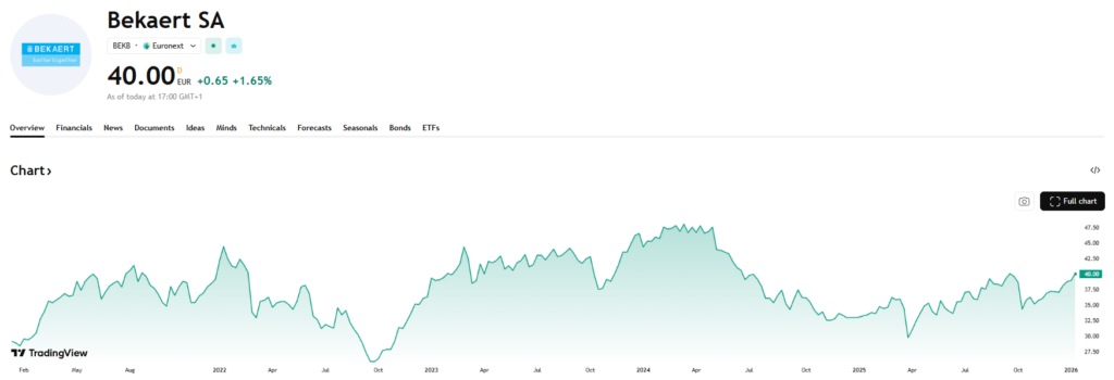 Bekaert is een Belgische industriële groep gespecialiseerd in staaldraad en coatings, met toepassingen in onder meer de auto-industrie, energie en infrastructuur. Het is geen pure bulkstaalproducent, maar blijft door zijn focus op staaldraad en coatings sterk afhankelijk van industriële volumes. Bekaert bleef de voorbije jaren relatief onder de radar. Het aandeel combineert cyclische gevoeligheid met een zekere technologische differentiatie, wat het interessant maakt als kleinere, meer gespecialiseerde industriële speler. Bekaert noteert aan slechts 8 keer de verwachte winst en eveneens 8 keer de verwachte vrije kasstroom en keert al enkele jaren een groot deel van de winst uit aan de aandeelhouders in de vorm van dividenden en inkopen van eigen aandelen.