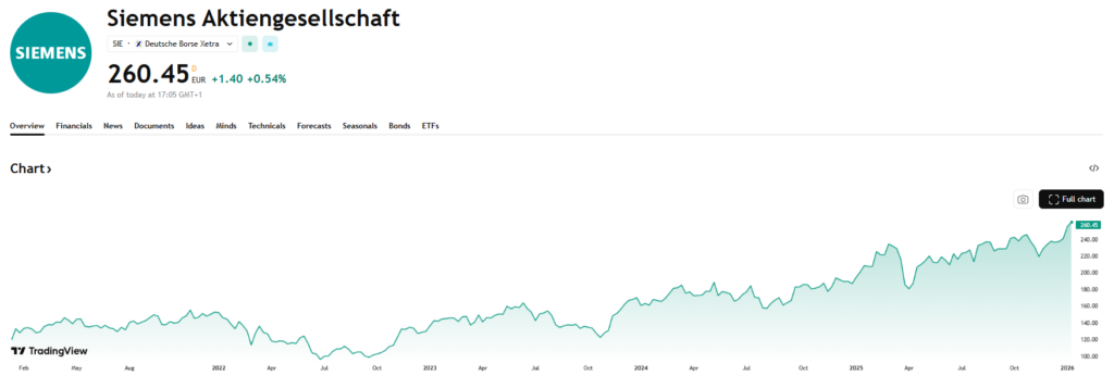 Waar veel industriële bedrijven het de voorbije jaren moeilijk hadden, bleef Siemens relatief sterk presteren. De Duitse groep is actief in automatisering, energie-infrastructuur en mobiliteit, met een sterke focus op industriële software. Dankzij structurele thema’s zoals elektrificatie, digitalisering en datacenters is Siemens minder cyclisch dan klassieke industriële spelers. Met een marktkapitalisatie van circa 200 miljard euro behoort het bedrijf tot de grootsten in Europa en fungeert het eerder als kwaliteitsanker dan als herstelverhaal. Siemens noteert aan 22 keer de winst. Daartegenover staat een brutomarge van 39% en een geannualiseerde omzetgroei van meer dan 7% de voorbije 5 jaar.