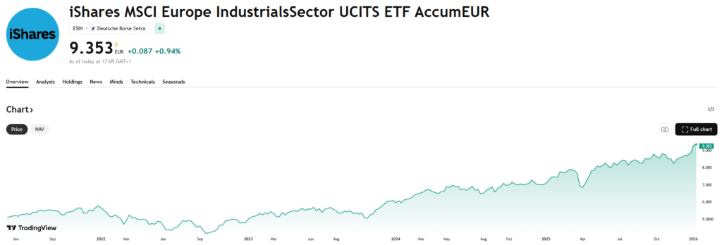 De iShares MSCI Europe Industrials Sector UCITS ETF (IE00BMW42520) is de meest geschikte keuze voor beleggers die breed willen inzetten op de Europese industriële sector. Deze ETF volgt de MSCI Europe Industrials 20/35 Capped-index en biedt blootstelling aan een ruim spectrum van industriële bedrijven, zoals Siemens, Schneider Electric, Airbus, Rolls-Royce en Safran. De lopende kosten bedragen 0,18% en de ETF werkt met volledige fysieke replicatie en is accumulerend, waardoor dividenden automatisch worden herbelegd. Met 1,1 miljard euro aan beheerd vermogen is dit een grote en liquide ETF die zich uitstekend leent als kernpositie binnen dit thema.